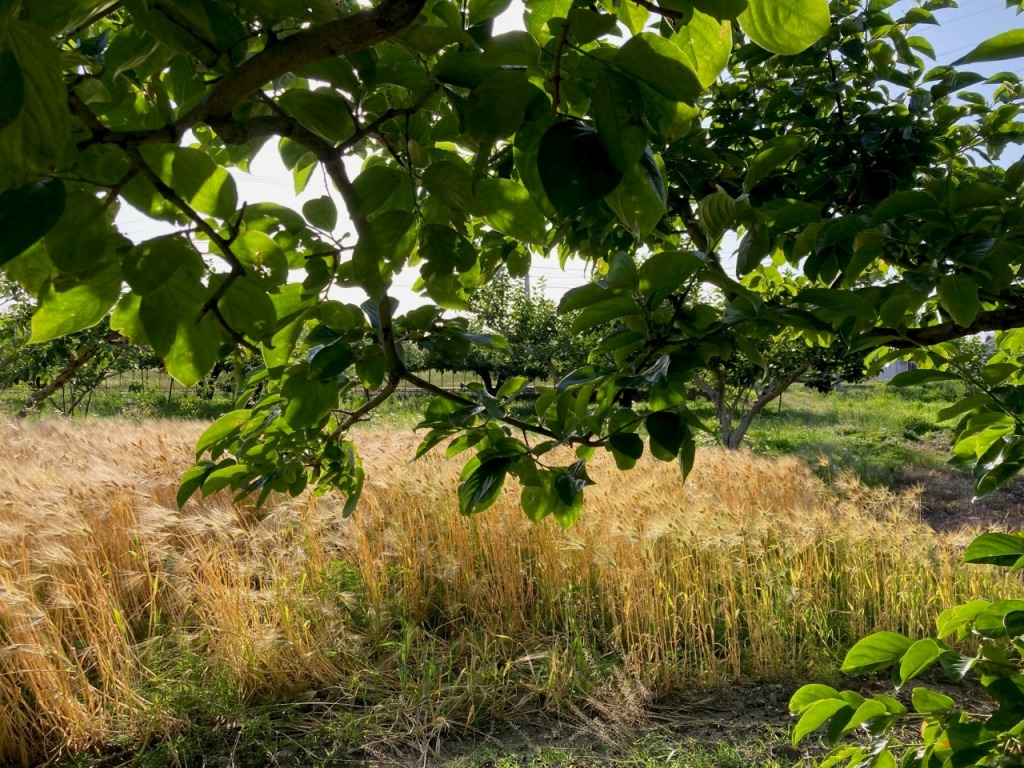 麦の秋は俳句では夏の季語です。摘果作業で帰省した際、柿畑の隣りはその通りでした。