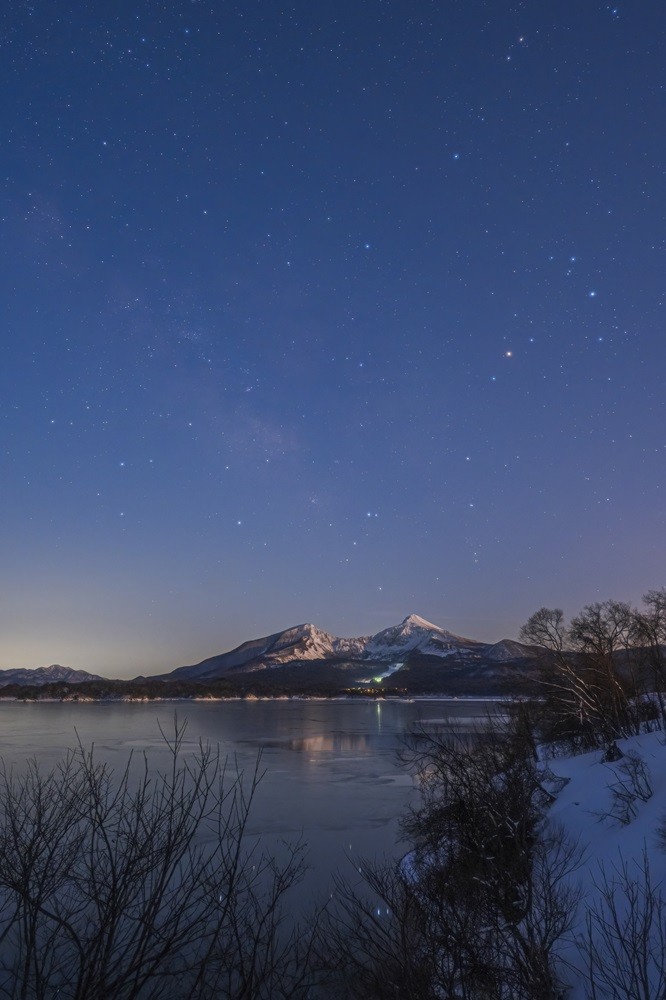 凍結した桧原湖の向こう、月に照らされた磐梯山の上に星空が広がり薄っすら天の川も見えます。