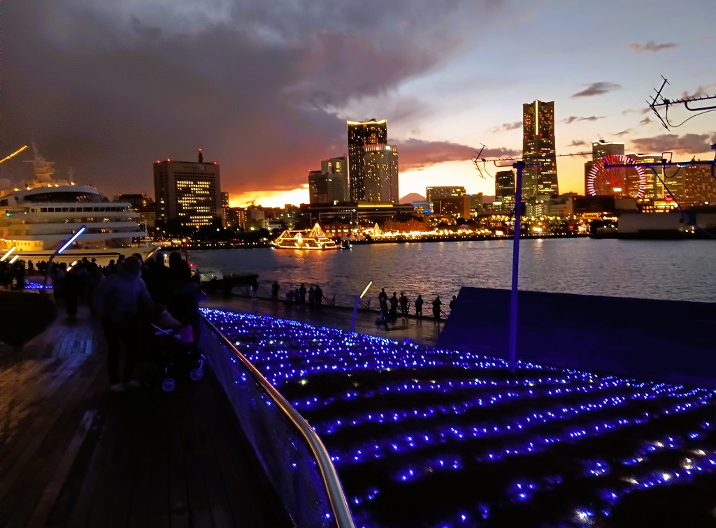 飛鳥Ⅱ出港時の横浜大桟橋先端からの写真です。 ランドマークタワーの少し左側に富士山が小さく見えています。 横浜は昨年12月 『日本新三大夜景都市』の2位に選ばれたそうです。 (2024.12.14 撮影)