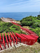 二か所目は、長門市の絶景スポットとして人気のある元乃隅(もとのすみ)神社です。日本海に面した断崖絶壁の上に123基の朱色の鳥居が100m以上にわたって並んでいます。また、鳥居の高さは6m、賽銭箱の位置は5mの高さにあり「日本一入れにくい賽銭箱」の投げ入れに挑戦してきました。