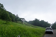 高峰高原に到着。標高1,950m、車の外気温計は20度。ひんやりでは無いけれど、十分快適、車の窓全開で走ると爽やかです。この辺りはキスゲ咲く場所だけれど、1週間ぐらい早かったようです。ほんの少しだけ咲いていました。 |
