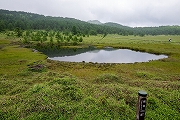 湿原の低地にある鏡池。20年前は池の向こうの樹木はなかった。湿原全体に湿性植物が減り、だんだん陸化が進んでいる感じです。 |