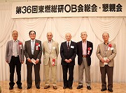 松下副会長の「総会開会」の辞に続き、前総会以降の物故会員7名の方々に黙祷を捧げご冥福を祈りました。その後、礒田会長の挨拶、大橋全東燃OB会事務局長のご挨拶、ご来賓の東燃ゼネラル石油(株) 執行役員西村中研所長のご挨拶と活動説明を頂いた後、総会の議事に入りました。
