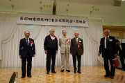 米寿の甘利忠雄氏、喜寿の寺田英敏氏、岡野正平氏、小峰喜久治氏に「長寿お祝い記念品」を贈呈し、甘利氏の感謝の辞をお聞きして会員全員の拍手で皆様のご長寿をお祝いいたしました。最後に礒田会長より役員6名の担当役割継続を伝達して総会を無事終了しました。