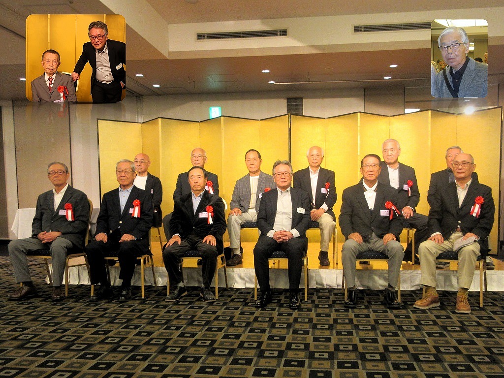喜寿お祝い 挿入写真 左上 木村 隆様、高橋会長 右上 阿部 正浩様 後列左より 須藤 和男 様、神山 節夫 様、柏 明夫 様、入江 明彦 様、安藤 栄治 様、山崎 亨 様 前列左より 竹中 康雄 様、大内 健伍 様、針原 哲巳 様、高橋会長、阿部 雅弘様、山本 武夫 様