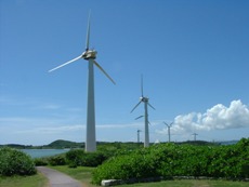 西平安名崎(にしへんなざき)は、宮古島の北西端、池間島まで僅か2kmほどのところに位置する岬。付け根から池間大橋が伸び、真っ青な海と橋の全景、その先に浮かぶ池間島がはっきりと見渡せる。岬では風力・太陽光・波力などの自然エネルギーを利用した発電が行われており、生み出された電力の一部は島内の家庭に供給されている。青い空に映える真っ白な風車が5基並び、大きいものでは直径28m。風車がゆっくり回る独特な風景は見もの。
