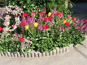 春爛漫で花盛りなのは、前庭のチューリップ・桜草・フリージア・ムスカリ、裏庭は一重の山吹・水仙・枝垂れ桃・ボケなど、山庭はクリスマスローズ・スノーボール・山吹・かいう・マーガレット・などが咲いています。