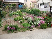 前庭は家庭菜園と花壇で半々で、菜園には現在ジャガイモの芽が出始め、エンドウとスナック豆の花が咲き始め、たまねぎは太くなる前で、サトイモは葉がなく土の中で食べるとき掘っています。これからはナス・きゅうり・サツマイモと続きます。