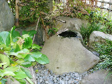 蹲(つくばい)周りは、四季おりおりの景色を楽しめる。一番のお気に入りは、縁側に座り月見酒を酌み交わすこと、純米酒で。