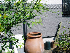 次に、雨樋から雨水を横取りする「パッコン」(商品名)を取り付け、スペイン製のカメに貯水、花壇や洗車などに利用している。