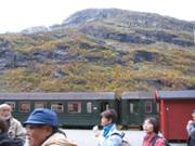 北極圏の駅では昼間の気温9℃前後、南部の首都部で13℃前後、丁度、紅葉真っ盛りの時期と重なり車窓展望におまけが付きました。広々とした牧草地と黄変色した低木が茂る森林に、大小の湖沼群が次々あらわれる絶景。都市部の駅付近には煙突、工場もまばら、美しい赤錆色の低層住宅。さらにノルウエーではフィヨルド海面に注ぐ滝、デンマークでは発電風車、等が景色に変化を与えてくれました。(但し、技術不足のため走行中、車窓から写真は撮れませんでした)