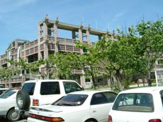 公開設計競技によって1981(昭和56)年4月に建てられた庁舎で、ピンク色のレンガ造りが、各階外壁に付けられた56個のシーサーとともに目をひいている。空間の多い独特な外観は、省エネのために室内に常時涼風を送り、クーラー要らずにするための設計(現在は空調設備を付けているとか)。それに市民とのコミュニケーションの場として、沖縄独特のアサギテラスが設けられているのも大きな特徴である。美ら海水族館へ行く道中で見ることができる。