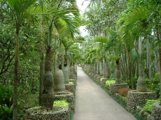 エスニックガーデン 原色の花咲く熱帯花木、香り高い実をつける熱帯の果樹が所狭しと茂り、南国のジャングルを作っている。園内には450種以上の観賞用ヤシが植えられているが、ここでは日本一のトックリヤシ並木、ユスラヤシの並木が素晴らしい。このガーデンは、道に迷うことがあるので、時間的に余裕がなければ全部回ることができない。