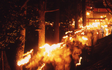 「お灯まつりは男の祭り、山は火の滝、下り龍」といわれるように、祭の夜に延々と山腹を駆け下る炎の帯はまさに「下り龍」そのものである。