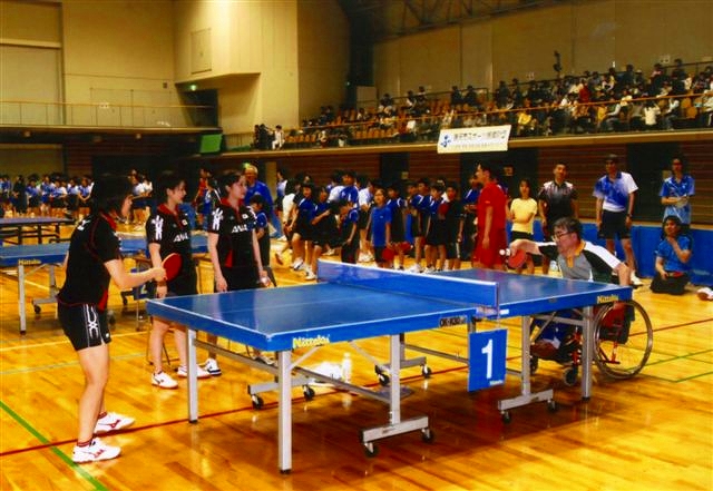 福原選手と福岡選手が見守るなか平野選手との対戦中