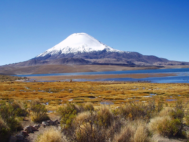 1.パリナコタ火山(6,330m)をはじめ6,000m級の火山群が取り囲み、周辺草地にはビクーニャ、グアナコ、ジャマ等が戯れ、湖面には水鳥が群舞する4,500mの高地のチュンガラ湖は、壮大で不思議な風景のところです。