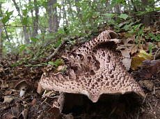 大形で傘は直径10~25cm、中央部が深くくぼみ、茶褐色で、角状のササクレに覆われ、裏面は針状で淡色です。 茸狩りの上位の獲物で特に乾燥させると香りを増し炊き込みご飯に向きます。