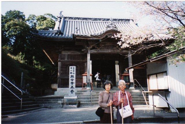 四国霊場第八番「熊谷寺」本堂前にて妻と