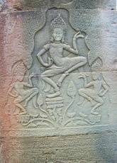 回廊には、アンコールワットの浮き彫りにも匹敵する彫刻群がある。外側の回廊の壁には戦闘図、風景図等が。中央の祠堂の回廊には四面仏が目線で見れる。