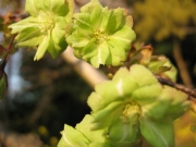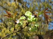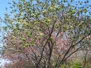 古墳からは、顔が表裏に有る「両面人物埴輪」、翼を広げた「飛ぶ鳥の埴輪」や矢を入れる道具を象った「胡籙形埴輪」等数々の日本初の発見があり、民俗資料館に展示されています。 その他古代の民家集落や、「万葉集」に詠まれている植物約70種を集めた万葉植物園等が有り、四季折々の花が楽しめます。 そのほか黄緑色の花ビラの桜『御衣香』(ギョイコウ)が資料館東側と、紀州藩徳川家付家老(田辺城主)であった安藤帯刀直次遺愛碑の北側に2本あり、ソメイヨシノより少し遅れて八重桜と競うように咲きます。(写真ー3) サトザクラの仲間で黄緑色の花ビラの中心に紅色の筋が現れる珍しい桜花です。(写真ー4&5)