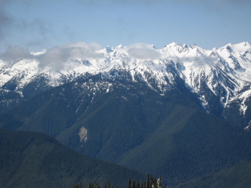 中央で雲の間に見える小さな3つのピークがオリンパス山