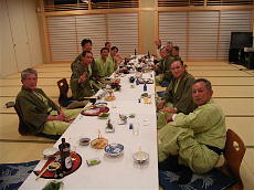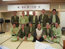 先ずは大広間で集合写真、バックの「歓迎・前田御一行様」には、みんな大爆笑。