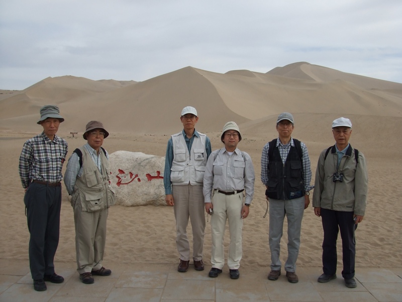 敦煌の鳴沙山をバックに全員で記念撮影