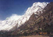 そして、その翌日はヒマラヤアンナ山郡の北側、秘境といわれるマナンへ。片道8K m、開けた谷筋、乾燥地帯の砂礫道、低いタマリスクや松の疎林の中を行く。途中にあるブラガの部落は見上げる裸の雨蝕の崖に、白いゴンパ(僧院)を囲んで黒い蝙蝠のような家々がへばりつくように立ち並び、更に背後の高い断崖の上から白雪のチベット境の峰が覗いている光景は、まるでJ.ヒルトンの「シャングリ・ラ」を彷彿させるもの があった。