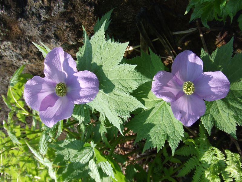 男岳の急斜面に咲くシラネアオイの花