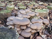 「キノコ圃場」は 畑の一角に、遮光設備や給排水・通気・防護柵など 出来るだけ自然の山の環境を保つ工夫がなされて作られていました。その時は、ヒラタケやヌメリスギタケなどが最盛期でした。