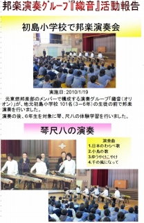 去る1月19日、東燃ゼネラル?和歌山工場のある 地元初島小学校において、3年以上の生徒約100名による邦楽演奏・体験学習のボランティア活動を行なって来ましたので、ご報告いたします。