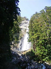 次の目的地「那智の滝」まで山道をしばらく走る。前日の雨で水量も多く雄大な滝をバックに記念撮影。
