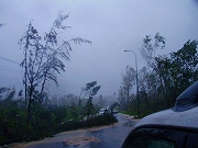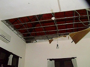 フィリピン本土で3日間暴れまわった台風が現地を直撃したのは9月28日、朝から暴風雨で道路に木が倒れこみ通行不可の連絡がありキャンプで待機、昼になって、風雨は、さらに強くなり、玄関付近でガチャーンと大音響、覗いて見るとポーチ部の天井が吹き込んだ強風に吹き抜かれて天井裏が丸見え。