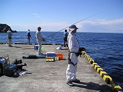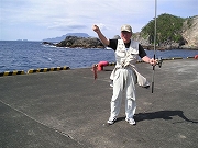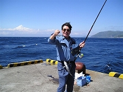 5月26日(水) 晴天で絶好の釣り日より、後発組の山口義之、大内健伍、中野邦昭、横道忠の4名が予定どうり高速ジェット船で11:35式根島に到着。先発組は野伏港で竿を出していたので、この日は後発組も午後から先発組に合流し、野伏港で17:30まで釣りに没頭した。