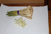 3)島らっきょ・薄皮を剥ぎ取り、葉っぱのほうは切り落とす。根っこから5cmぐらいの長さに切り、かつお節、しょうゆをふりかけ食べる。