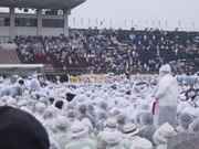 10/9の開会式は金沢市競技場に常陸宮ご夫妻を迎えての盛大な式典でしたが、生憎の雨模様で演出効果は半減しました。そんな悪条件の中、小学低学年の子供たちが競技場のトラック一杯に雨合羽姿で並び出迎えてくれ、私たち選手を感激させました。
