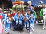 子どもたちの引く「花車」に、立派な神輿三基が加わりそうそうたる行列です。