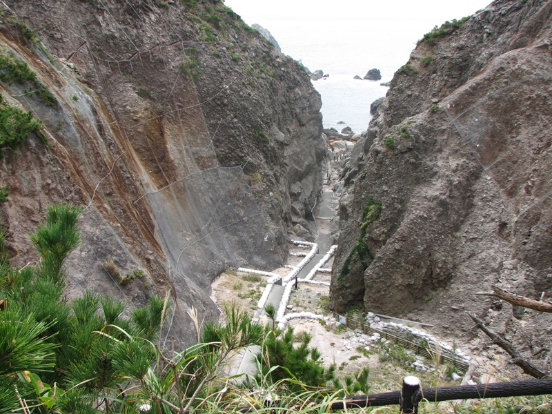 地面を鉈で割ったような断崖の先に地鉈温泉が潜んでいる