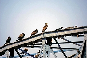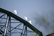 水際から上がってきた人が川下の橋の所にミコアイサが来ているらしいと教えてくれる。川下の方に行くとパイプを通した橋の欄干にダイサギとカワウが止まっていた。アオサギもいた。