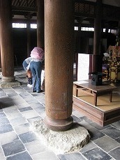 この釈迦堂は二層の建物に見えるが、一層目に見えるのは裳階(もこし)と呼ばれる軒下壁面に造られた庇状の構造物で、これはこの釈迦堂の他法隆寺金堂、薬師寺東塔等に見られる。堂内に入ると木割(きわり)が太く禅宗様式特有のがっちりとした感じを受ける。太い柱は上下端に丸みを持たせてすぼめた粽柱(ちまきばしら)で床面の礎石に置いた礎盤の上に乗せている。床面は瓦を布敷きに敷き詰めておりこれらも又禅宗特有の様式である。