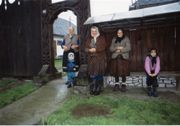 観光地化されていない、素朴で魅力的な木造民家の入り口で、伝統的民族衣装をまとった家族。