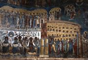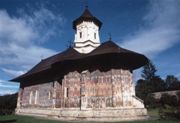 深い緑の森の中から現れる修道院、見どころは外壁を埋め尽くす、鮮やかのフレスコ画、周囲の芝生と良く調和して息をのむほど美しく描かれている。内壁にもびっしりと聖人の肖像画や宗教画が描かれていた。数しれずシャッターを切りました。