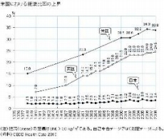 もう一つ、私の昔の記憶に比べて著しく変わったのが米国人の体型である。圧倒的に肥満体が多く、普通の体型の人間を見つけるのに苦労するほどだ。その肥満の度合いも日本人には見られない並外れたものだ。これが単に私の受けた印象ではなく、データとして確かめたいと思いネットを検索したところ、下図に示したデータを探し当て、印象の正しいことが証明された。