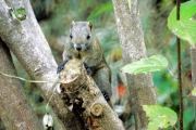 古民家の入り口近くに来ると目の前の木の根にタイワンリスが不意に顔を出した。