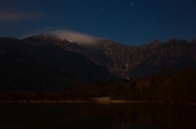 長時間露光(約8分)の写真は朝5時の大正池からのもので、肉眼ではほとんど山は見えない状態でカメラを向けています。