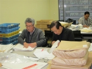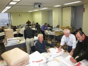 本社OB会の役員諸氏8名に加え、総研、川崎、KSS、TCCの各OB会の役員から2名ずつの応援を頂き、合計16名で2名ずつ8つの班に分け各班約350通ずつ担当し、合計2464通のカレンダーの発送作業に取り掛かり、夕方4時半までに無事終了いたしました。