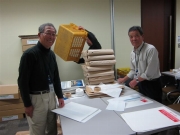 25部ずつダンボールで納品されたカレンダー100箱、2500枚を台車で作業予定の会議室に運び込み仕分けした後、用意した宛先ラベルを封筒に貼り、カレンダーを封入しガムテープで閉じる単純な作業です。しかしながら、郵メールのコスト削減のため、郵便番号別に細かい区分で紐でくくり、1通の数え間違いもなく、順番を崩さずコンテナーに並べて収めていく作業が予想以上に大変でした。