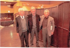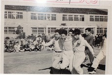 写真は脱蝋係時代の清水工場の大運動会の 一こまです。場所は袖師中のグランドです。何と58年前です。三 人四脚のメンバーと今でも走れそうな元気な顔で再会しました。変わっているのは髪の毛の色位です。