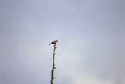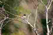 林に入るとコガラが盛んに鳴いていた。昨年まで左右2本の不安定な木道だったが1本の広い木道に改修されている。ノビタキを撮りたいと思っていたらちょうどよい位置に止まってくれた。撮影中「こんにちわ、こんにちわ…」と小学生の群れが通って行く。広い木道なので安心。少し先の葦原に立つ落葉松にアオジが止まった。