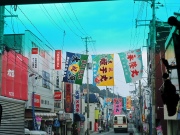 大漁旗: 区間運転の三陸鉄道で宮古市 田老地区の空虚を見た後、小本駅からのバスは被災の残る商店街を抜けていきます。珍しい観光バスに対して、地元の若奥さんは笑顔、子供たちは手を振っていました。